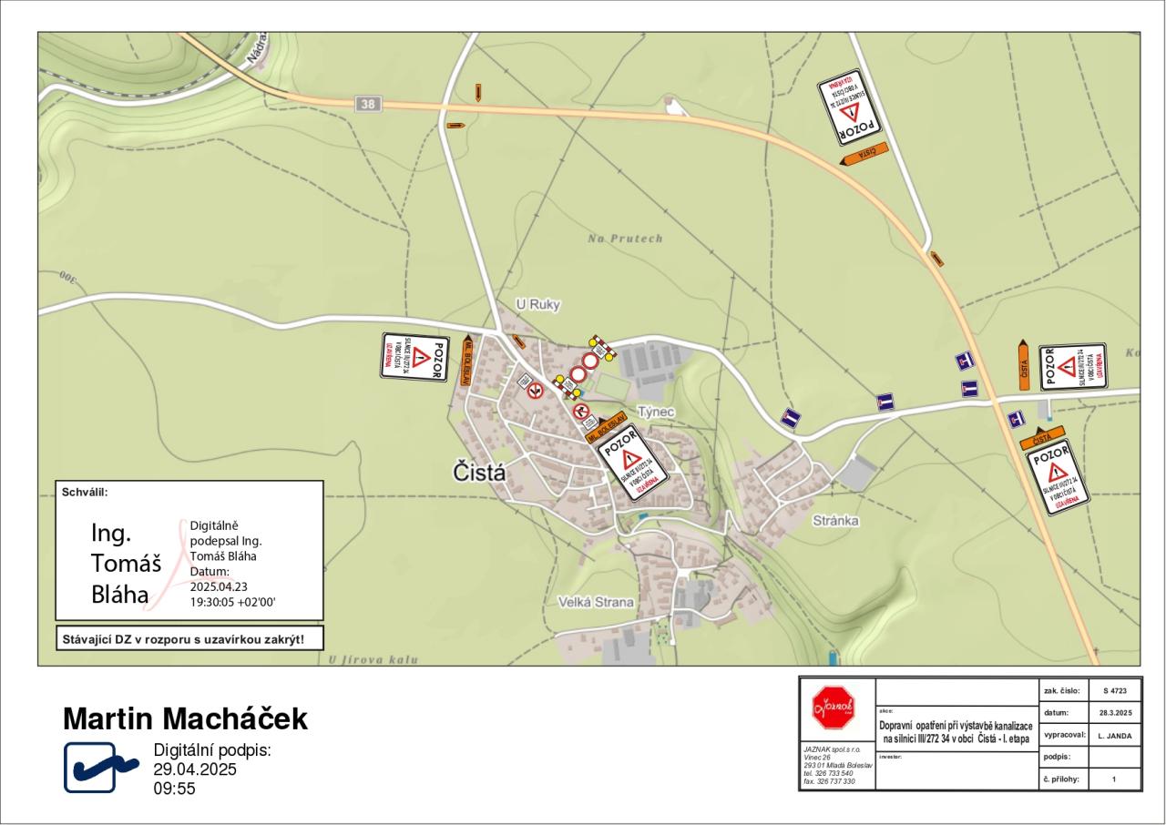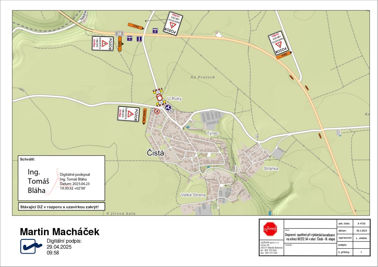 Sledujte prosím dopravní značení - objízdná trasa do obce pro všechny řidiče a autobusovou dopravu bude po obchvatu s odbočením do obce v křížení silnice III.třídy č. 27234 - Čistá / Bělá p. Bezdězem.