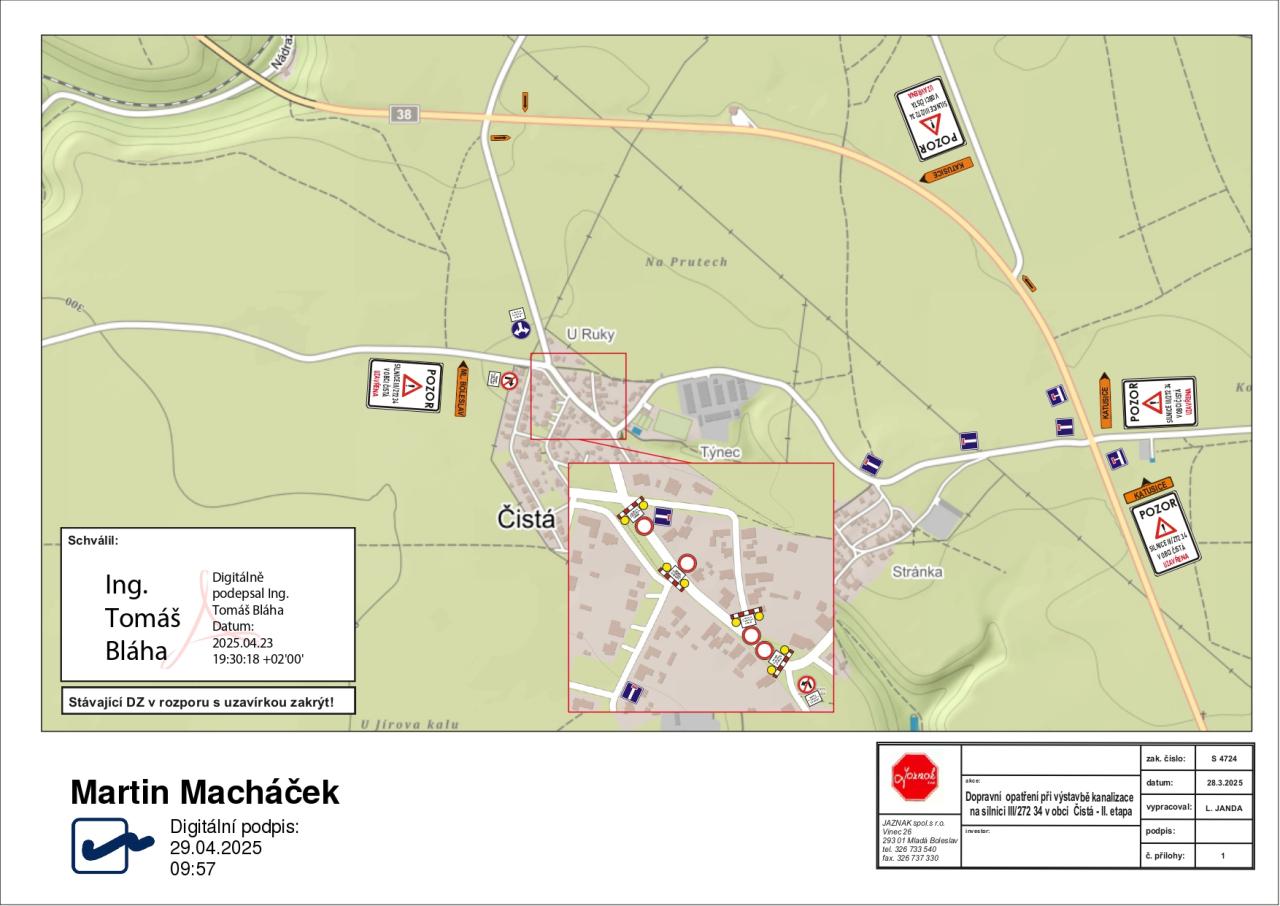 Sledujte prosím dopravní značení - objízdná trasa do obce pro všechny řidiče a autobusovou dopravu bude po obchvatu s odbočením do obce v křížení silnice III.třídy č. 27234 - Čistá / Bítouchov.