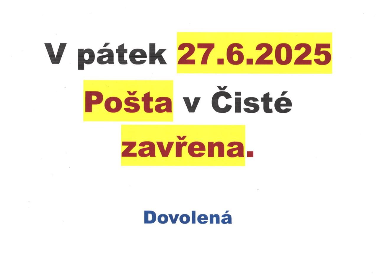 V pátek 27.6.2025 bude Pošta Partner v Čisté ZAVŘENA z důvodu dovolené.