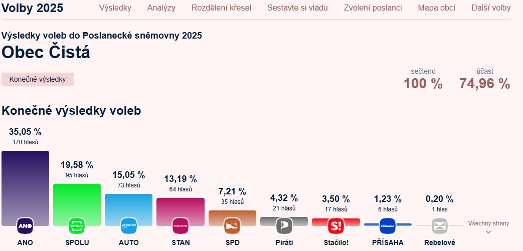 V přílohách naleznete výsledky do Poslanecké sněmovny v rámci republiky a výsledky v Obci Čistá