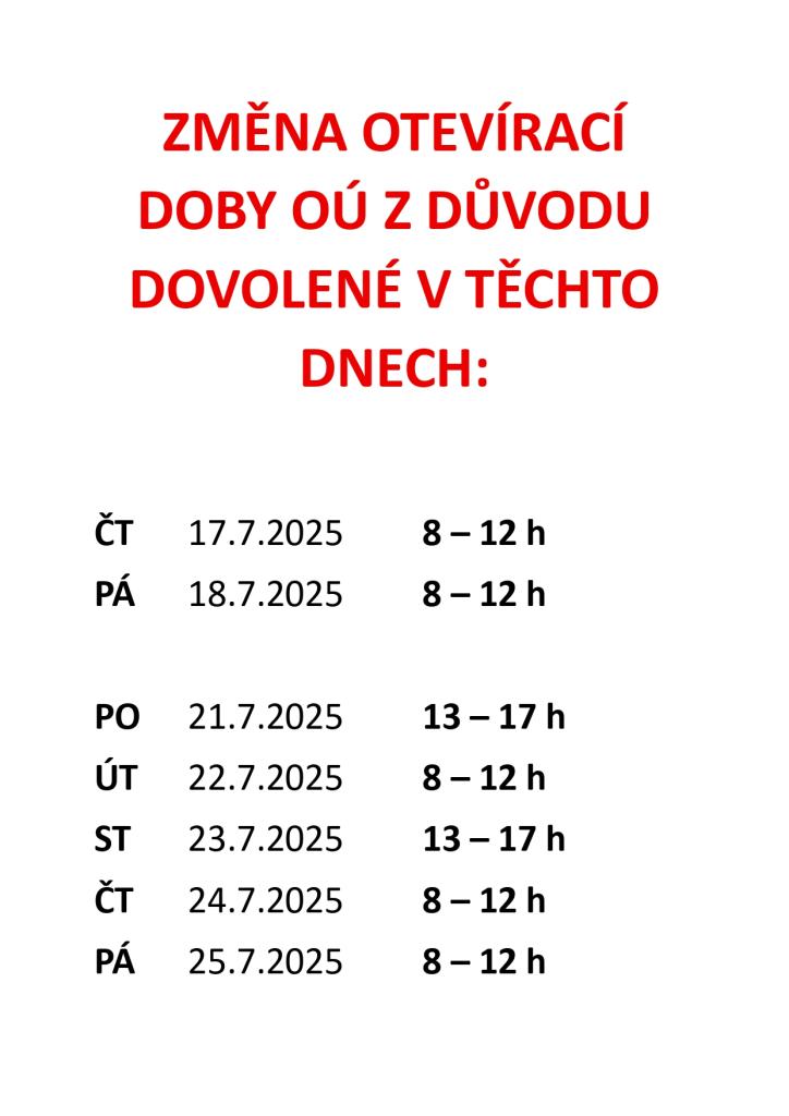 Změna otevírací doby OÚ z důvodu dovolené